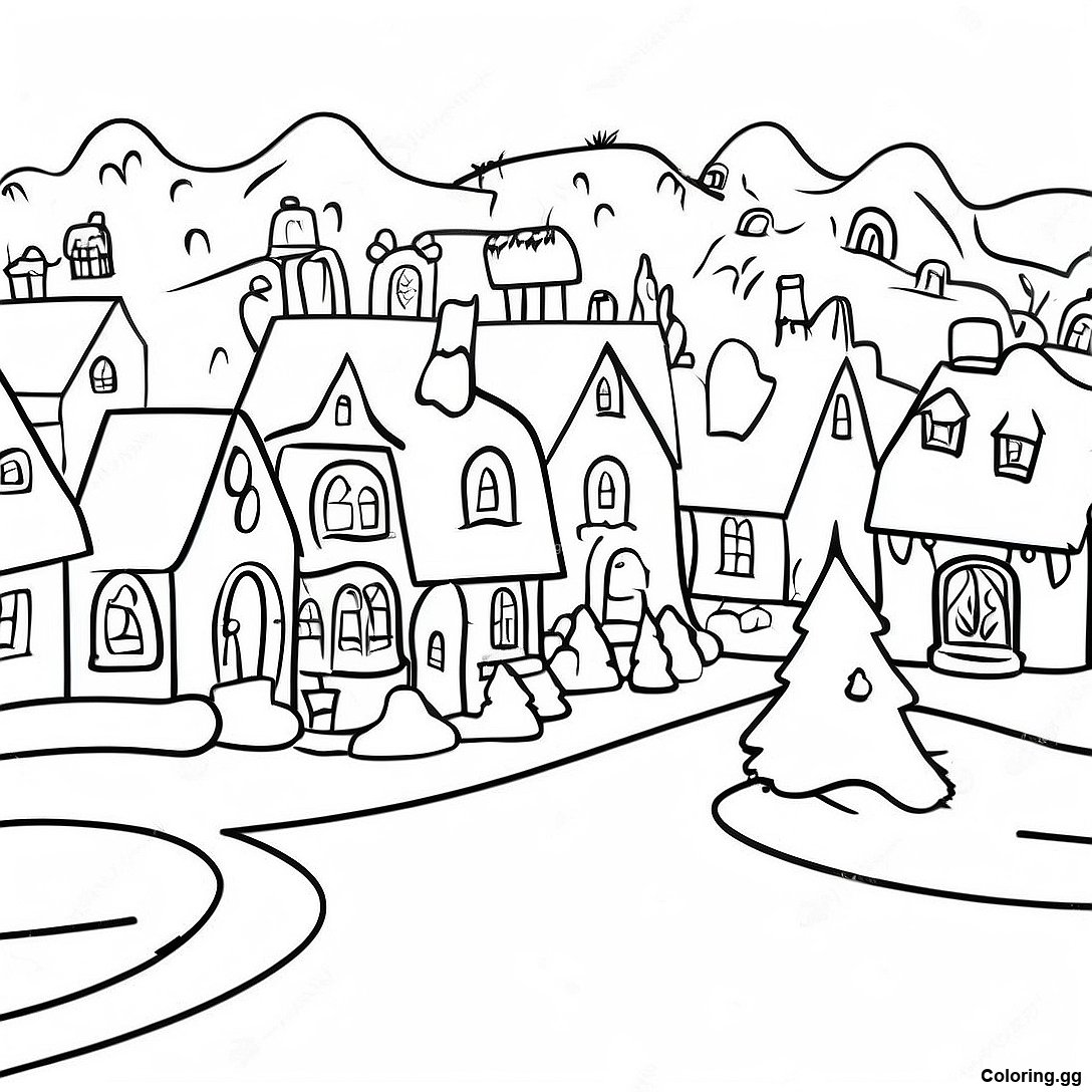 دانلود PDF قابل چاپ از صفحه رنگ آمیزی دهکده کریسمس برفی