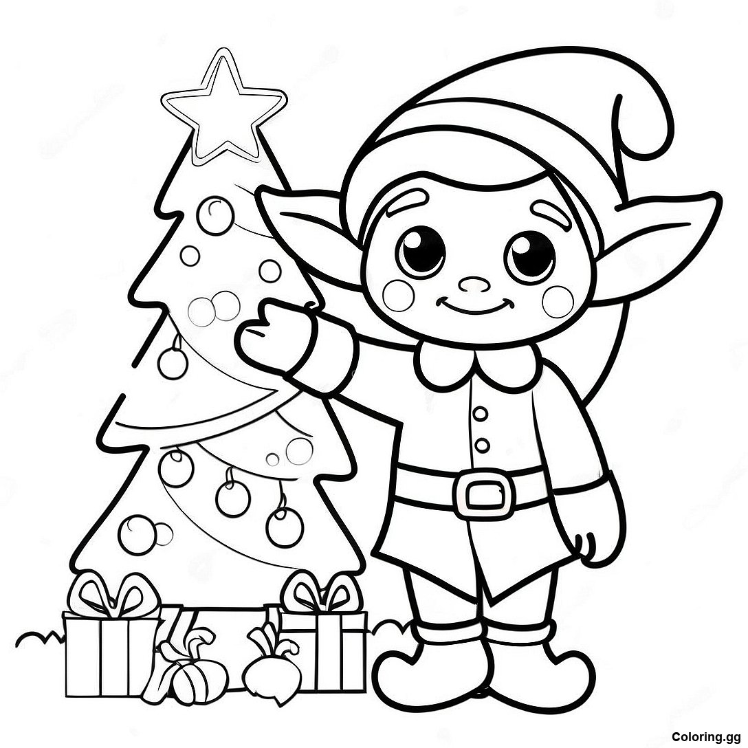 صفحه رنگ آمیزی الف شاد در حال تزئین درخت