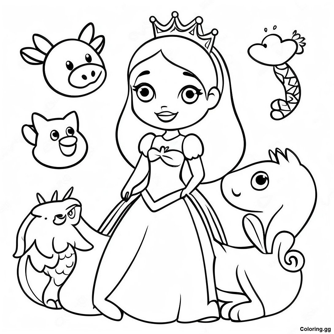 دانلود PDF قابل چاپ از صفحه رنگ آمیزی پرنسس بازیگوش با دوستان حیوانی