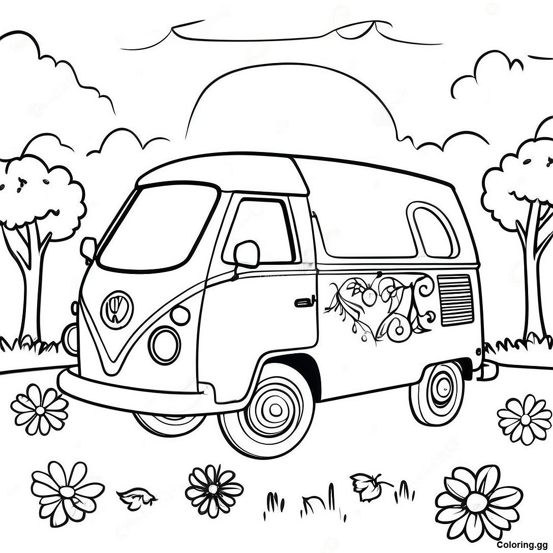 دانلود PDF قابل چاپ از صفحه رنگ آمیزی ون هیپی آرامش بخش دهه 70